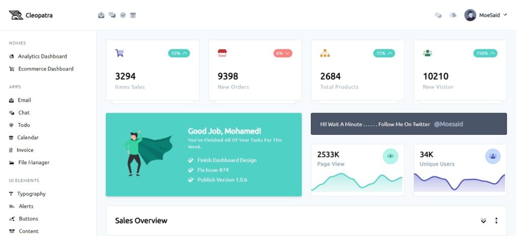 Cleopatra is a great admin dashboard built with the powerful Tailwind CSS. This template comes with rich features and easy to use packs and configurations. Cleopatra is licensed by MIT license. Also, this admin template has awesome browser compatibility and offers a big custom shortcode collection.