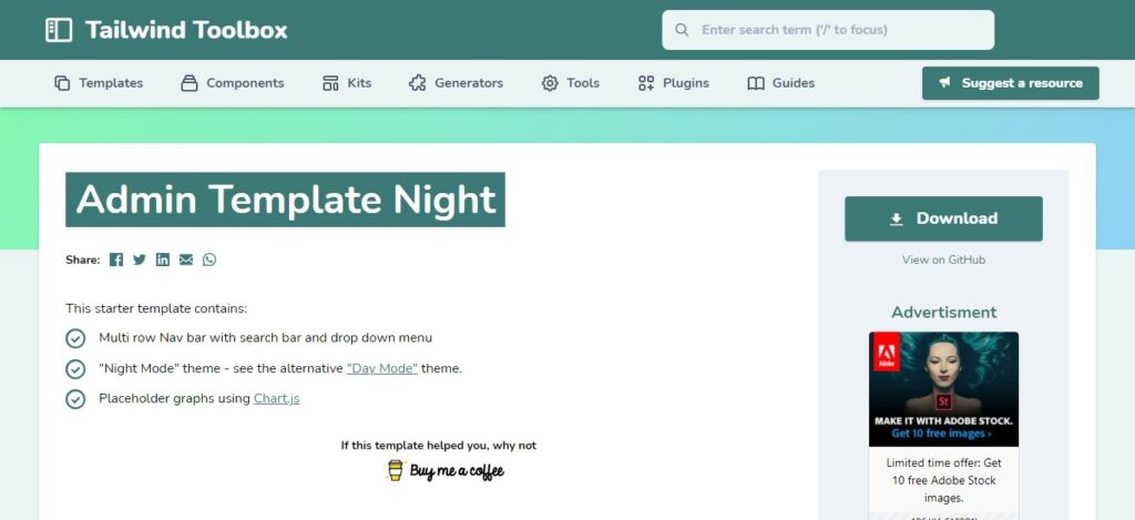Tailwind Toolbox Admin Template Night is a free tailwind CSS 'Night Mode' admin template. This open-source starter template comes with a multi-row nav bar, Search bar, and a drop-down menu. Also, it offers a night mode theme and an alternate light mode available. Moreover, This template is highly customizable and freely downloadable.