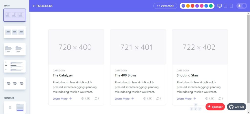 Tailblocks is a ready-made incredible collection of tailwind CSS blocks. This template comes with 15 different categories within a website like a blog, pricing, eCommerce, and many more. Also, Tailblocks includes a dark mode that is a trending design. Moreover, this template offers handpicked Tailwind blocks, Tailwind templates, Tailwind Components, and other free resources related to Tailwind CSS.